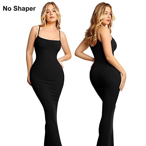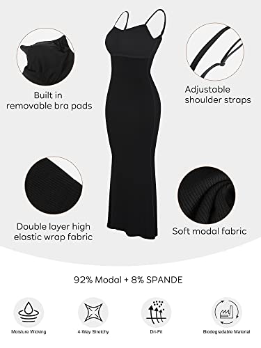 Popilush No Shaper Loungewear Slip Dress for Women Built in Bra Black Maxi Bodycon Spaghetti Strap Dresses, No Shaper Black Loungewear Dress, XX-Large
