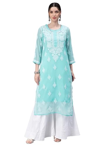 Seva Chikan Hand Embroidered Lucknowi Chikankari Blue Georgette Women Kurta with Cotton Slip (4328_Blue_M)