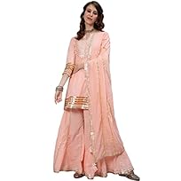 Peach A-Line Kurta With Sharara & Dupatta Set in Cotton Base With Sequin & Gotta Patti Embroidered. Has Sweetheart Neck, Three Quarter Regular Sleeves, Straight hem & Side Slits.ishin Women’s Pure Cotton Embroidered Gotta Patti Red Bandhani Print Straight Kurta suit set With Dupatta & Sharara
