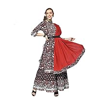 Maroon A-Line Kurta With Sharara & Dupatta Set in Cotton Base With Zari & Gotta Patti Embroidered. Has Round Neck, Three Quarter Regular Sleeves, Straight hem & Side Slits.ishin Women’s Pure Cotton Brown Zari Embroidered Peplum Kurta set With Sharara And Dupatta